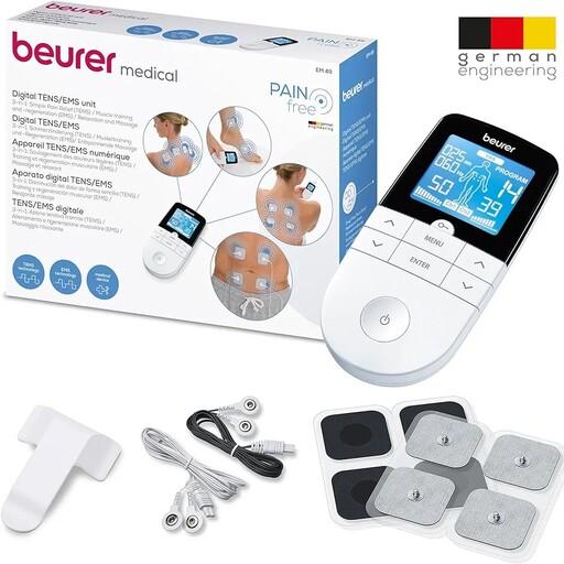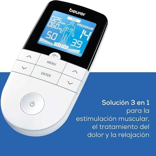 دستگاه Beurer EM49 با سه عدد باتری 1.5 ولتی کار میکند و برای درمان درد، تقویت عضلات و ماساژ طراحی شده است. صفحهنمایش LCD با نور پسزمینه آبی نیز کار با دستگاه را ساده و دلپذیر کرده است.