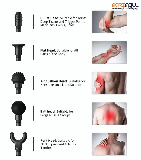 ماساژور رنفو R-C003 با ۵ هد ماساژ متفاوت ارائه میشود تا بتوانید برای هر بخش از بدن، ماساژی دقیق و مؤثر داشته باشید: